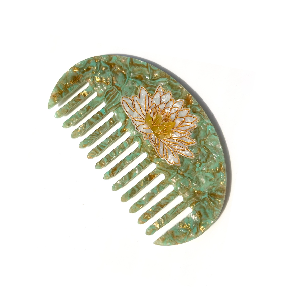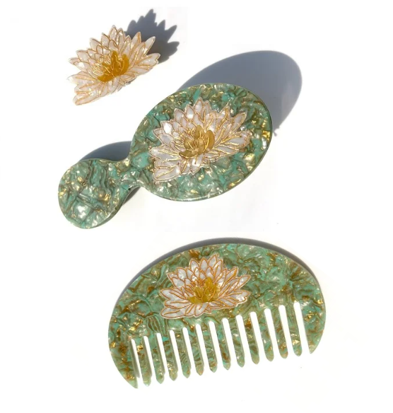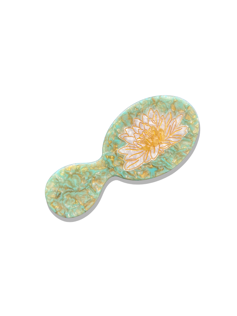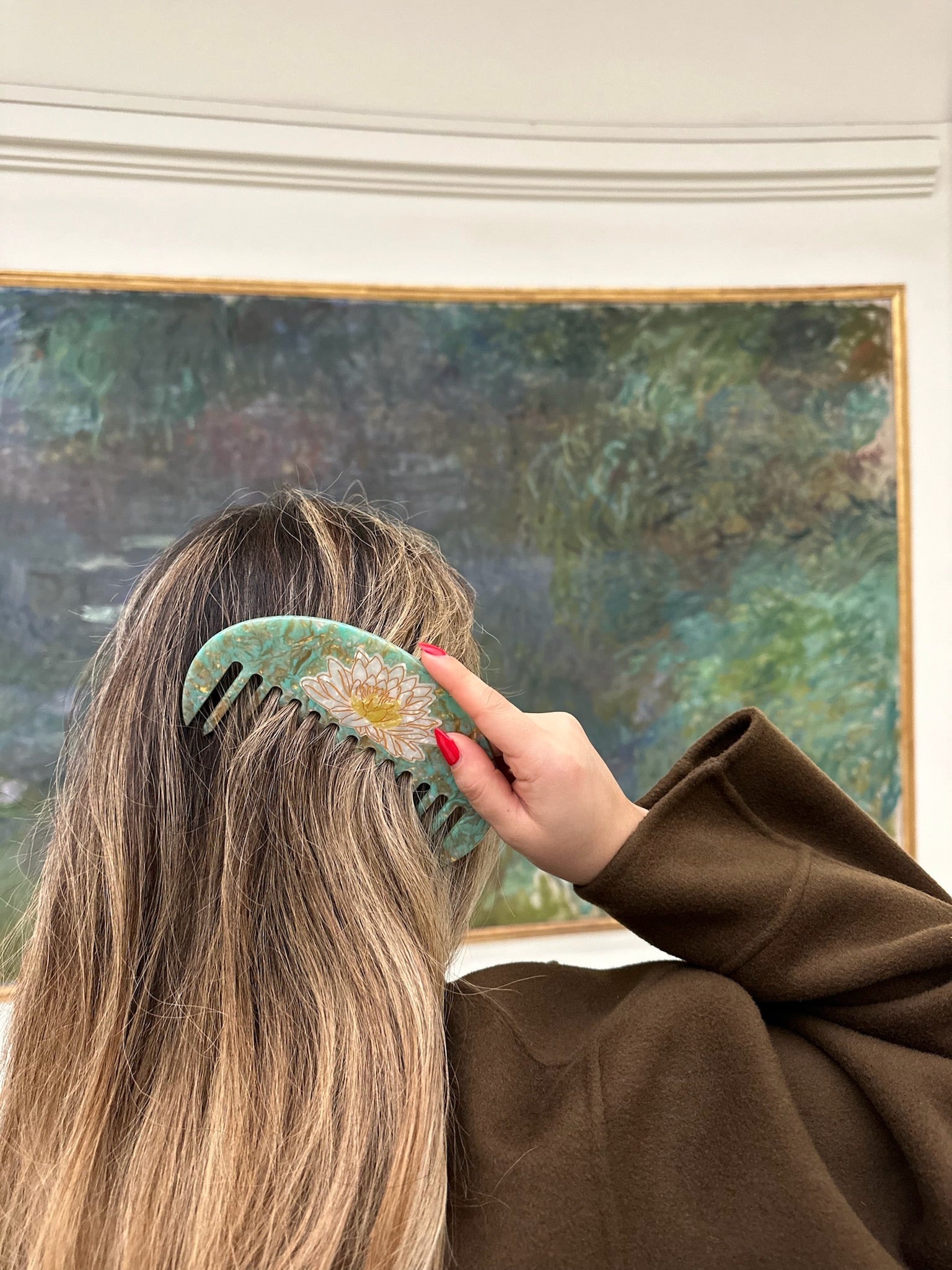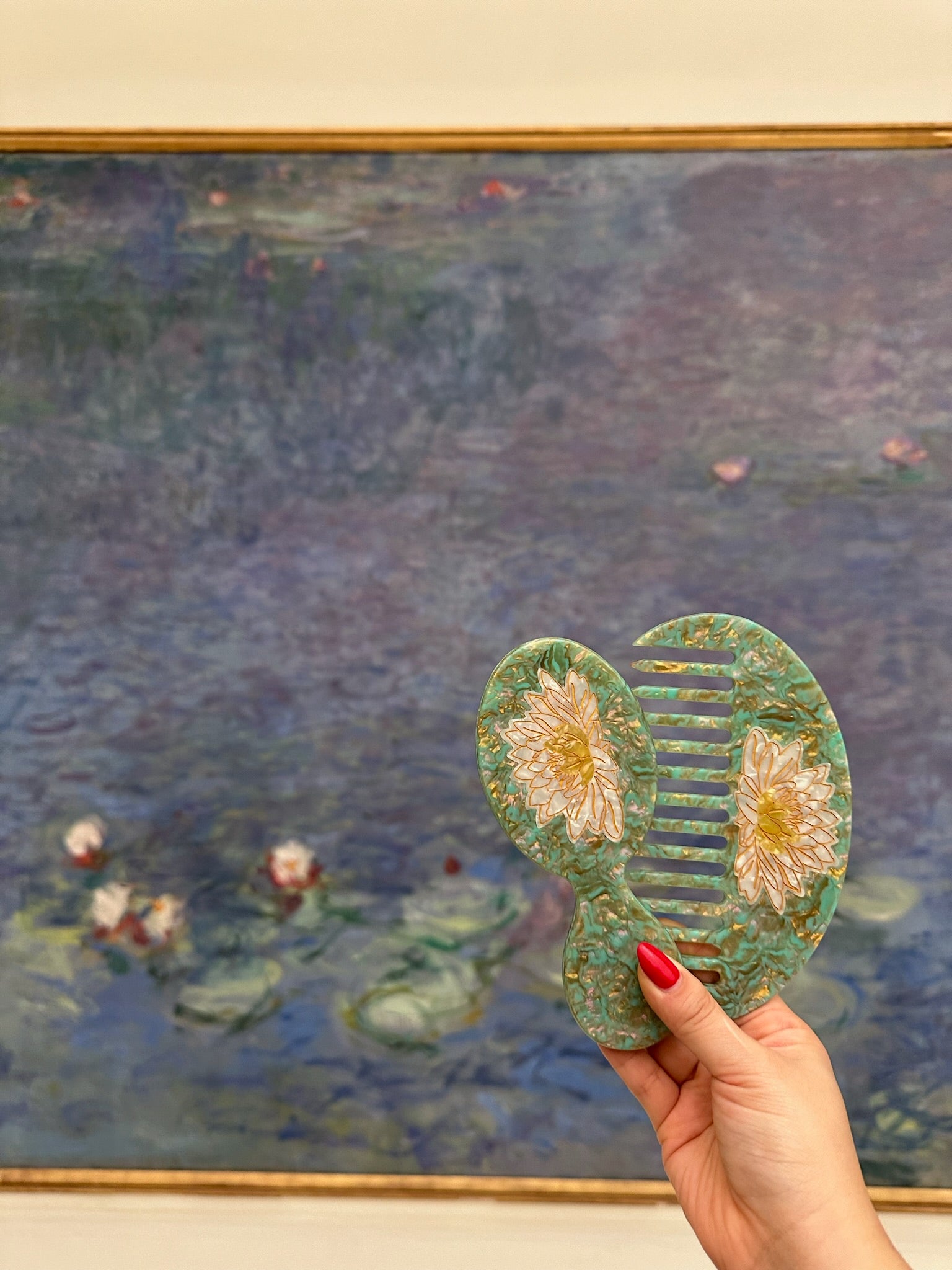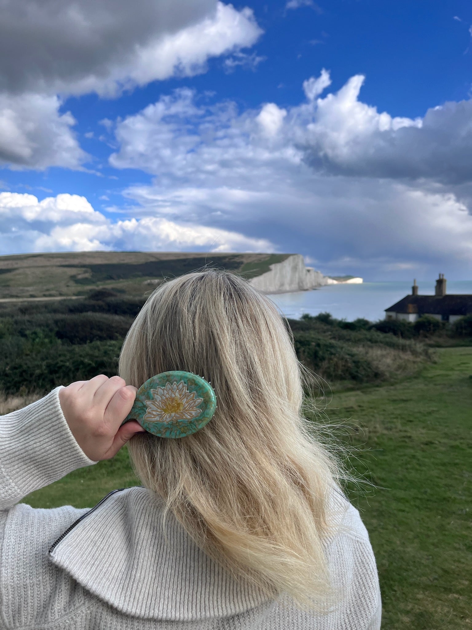 our water lily claw clip is hand painted by our Solar Eclipse artists.