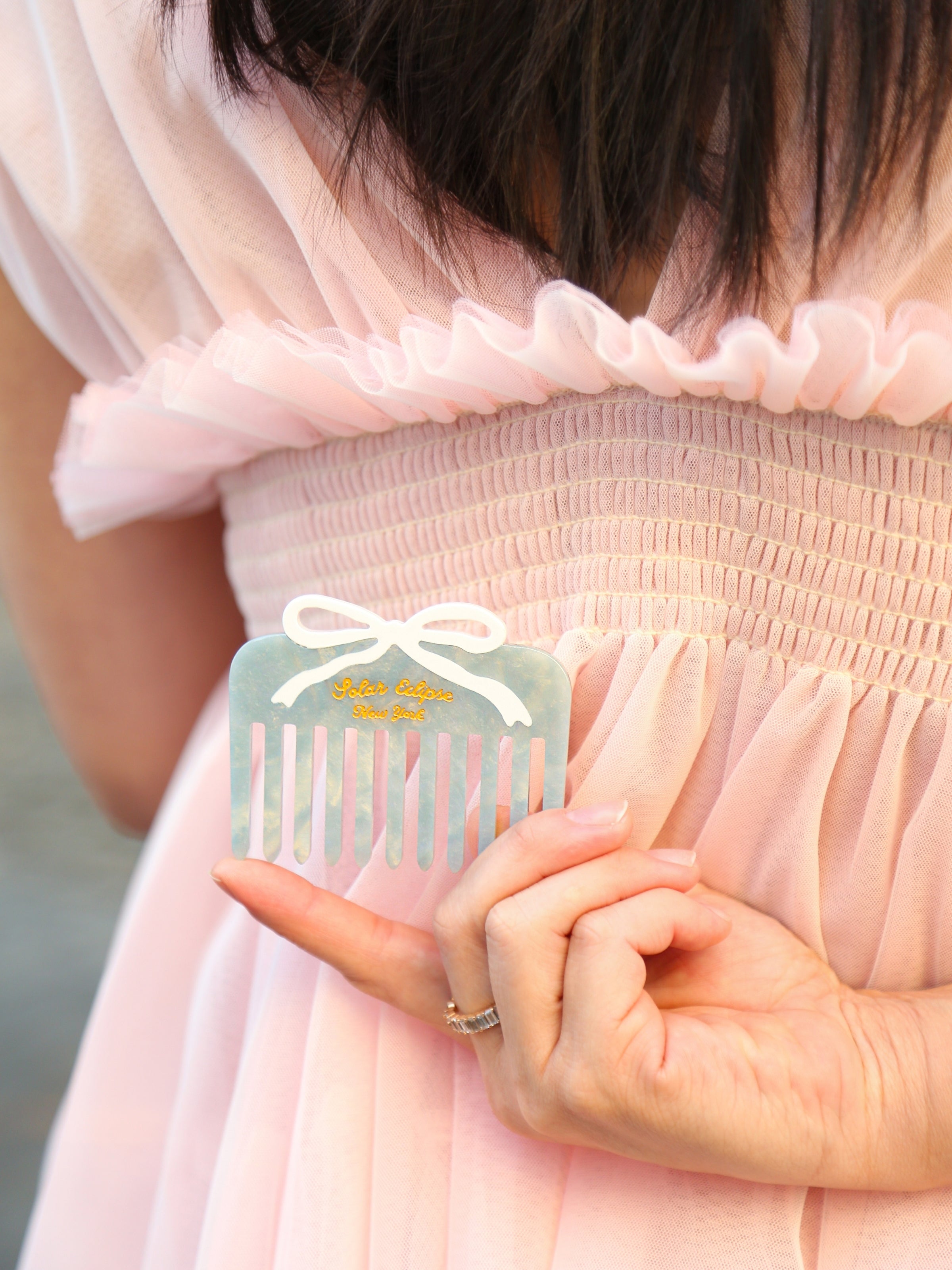 The Hand-painted Bow Pocket Comb in Pink channels a polished, feminine energy. Hand-painted with subtle shine, it’s playful, pretty, and perfectly balanced.