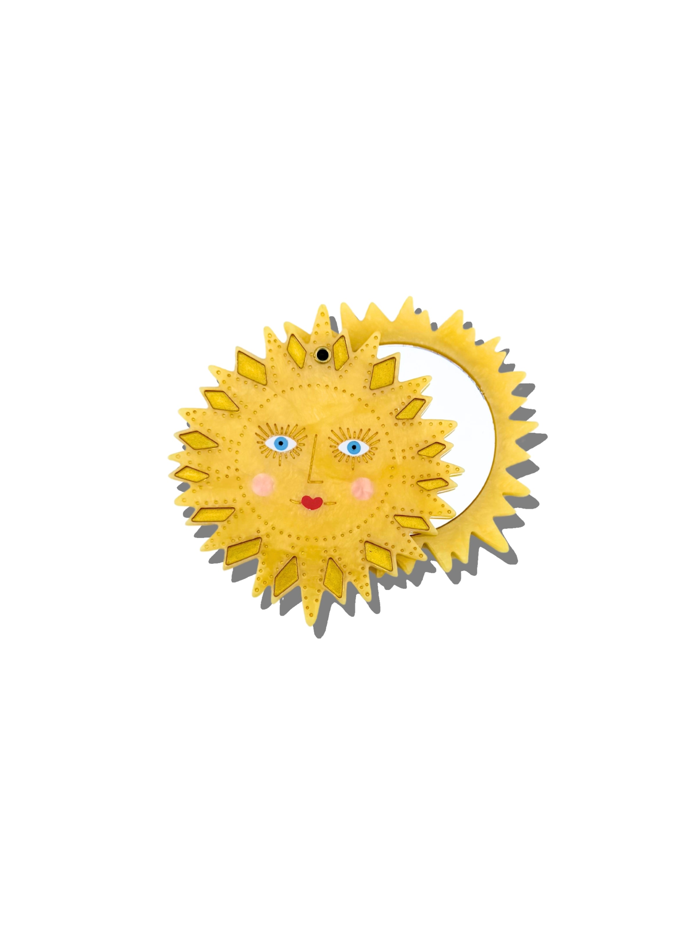 Each compact mirror features an original, hand-painted design by the artists at Solar Eclipse. Celestial Sun radiates warmth and artistry — golden rays, sculptural texture, and a luminous energy that captures light wherever you go.