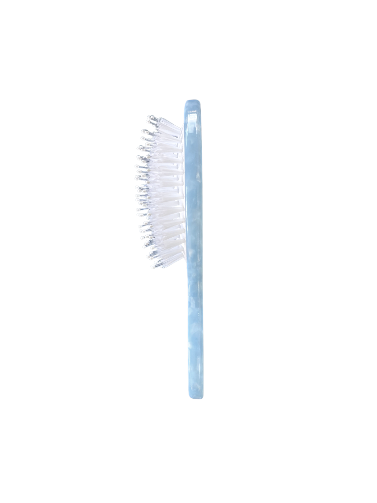 Vegan boar-like bristles distribute natural oils and smooth hair, while flexible pins gently detangle and massage the scalp.