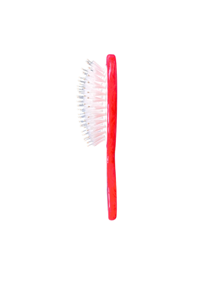 Vegan boar-like bristles distribute natural oils and smooth hair, while flexible pins gently detangle and massage the scalp.