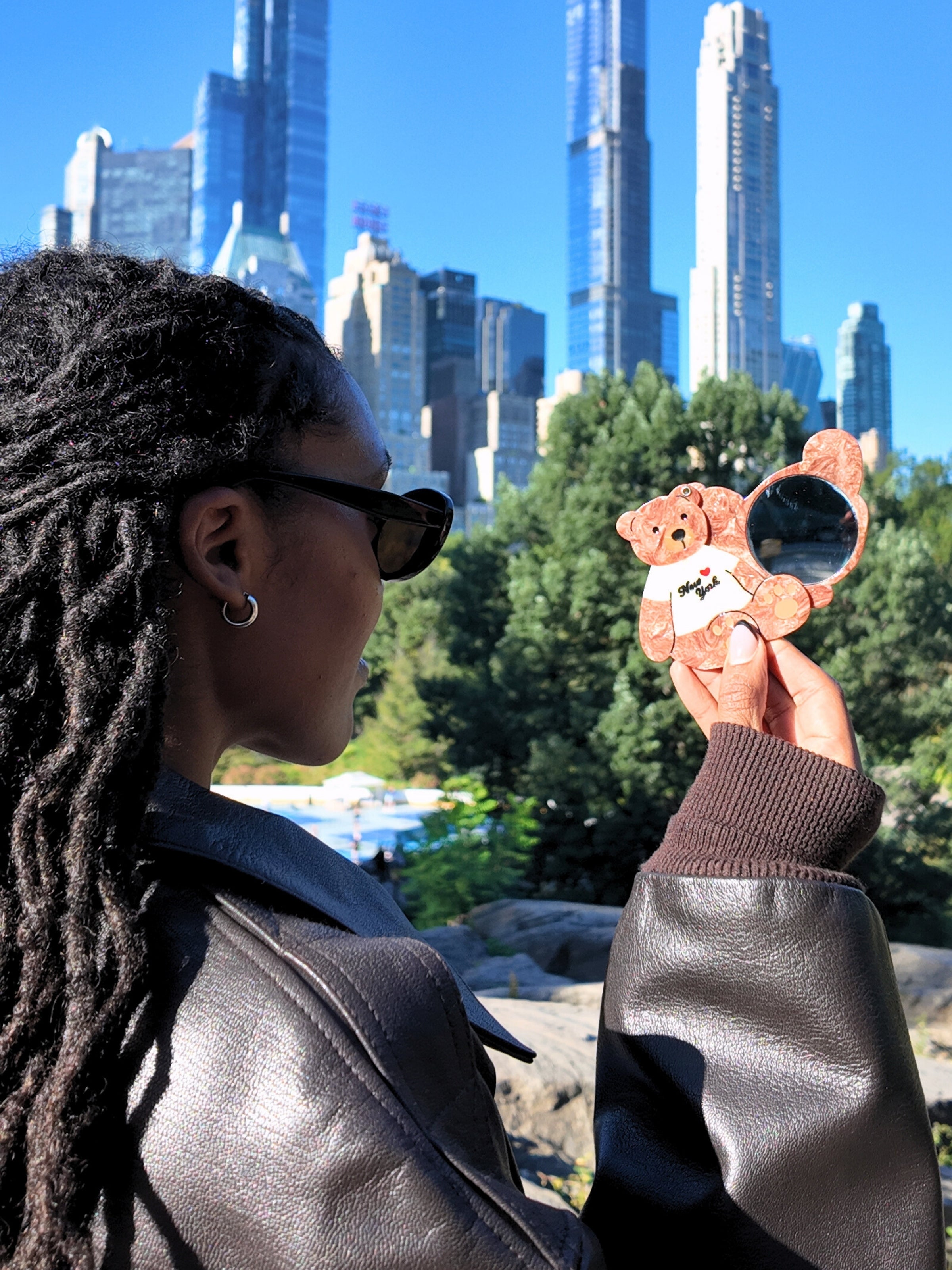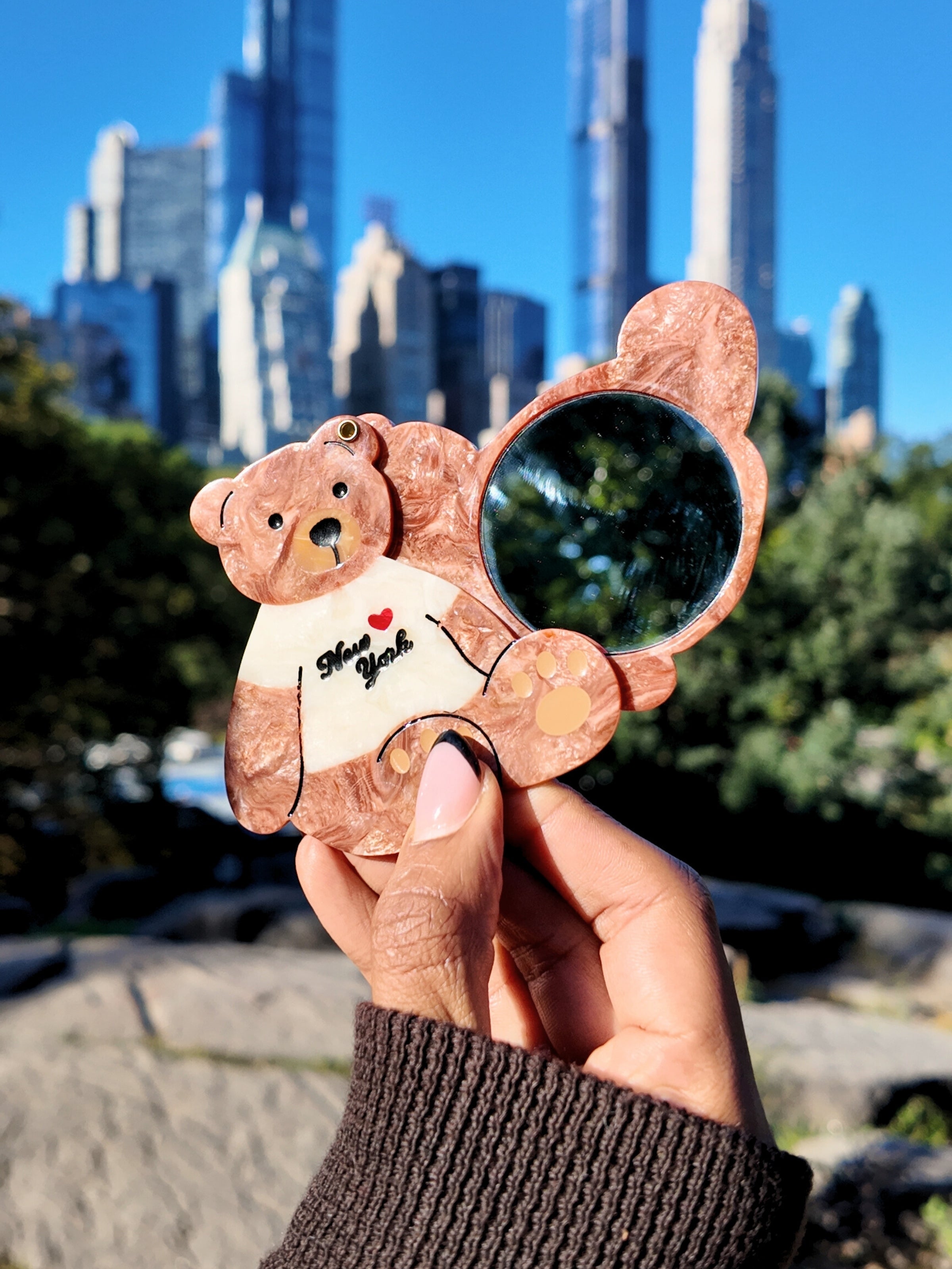 Each compact mirror features an original, hand-painted design by the artists at Solar Eclipse. New York Teddy Bear captures that unmistakable, iconic vibe — a little cozy, a little cool, and 100% New York energy you can carry anywhere.