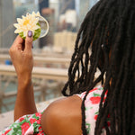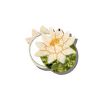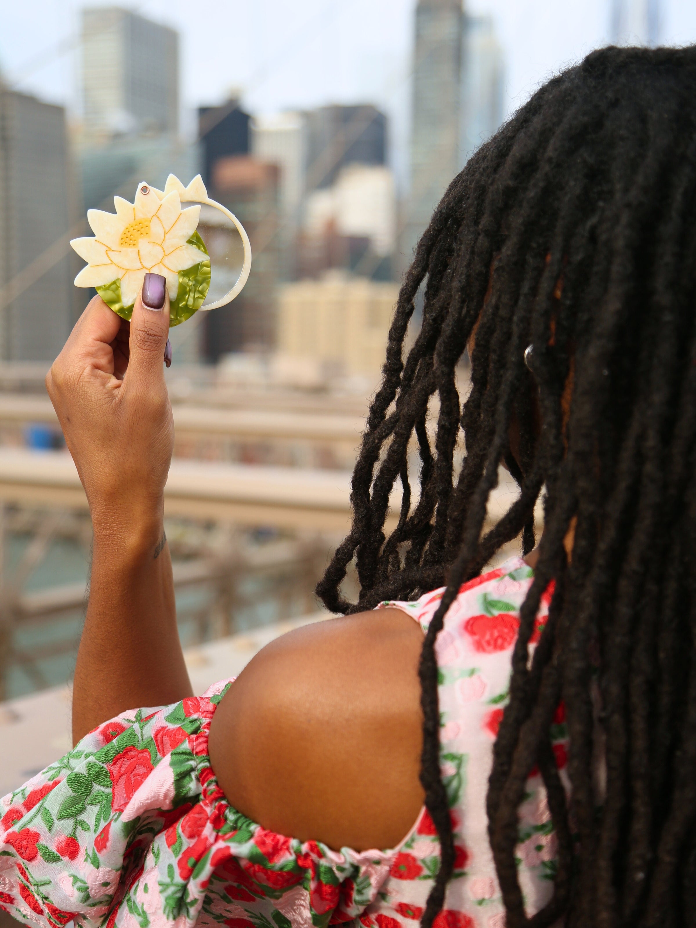 Each compact mirror features an original, hand-painted design by the artists at Solar Eclipse. Lotus symbolizes calm strength and rebirth — luminous petals unfolding in ivory, inspired by still water and quiet reflection.