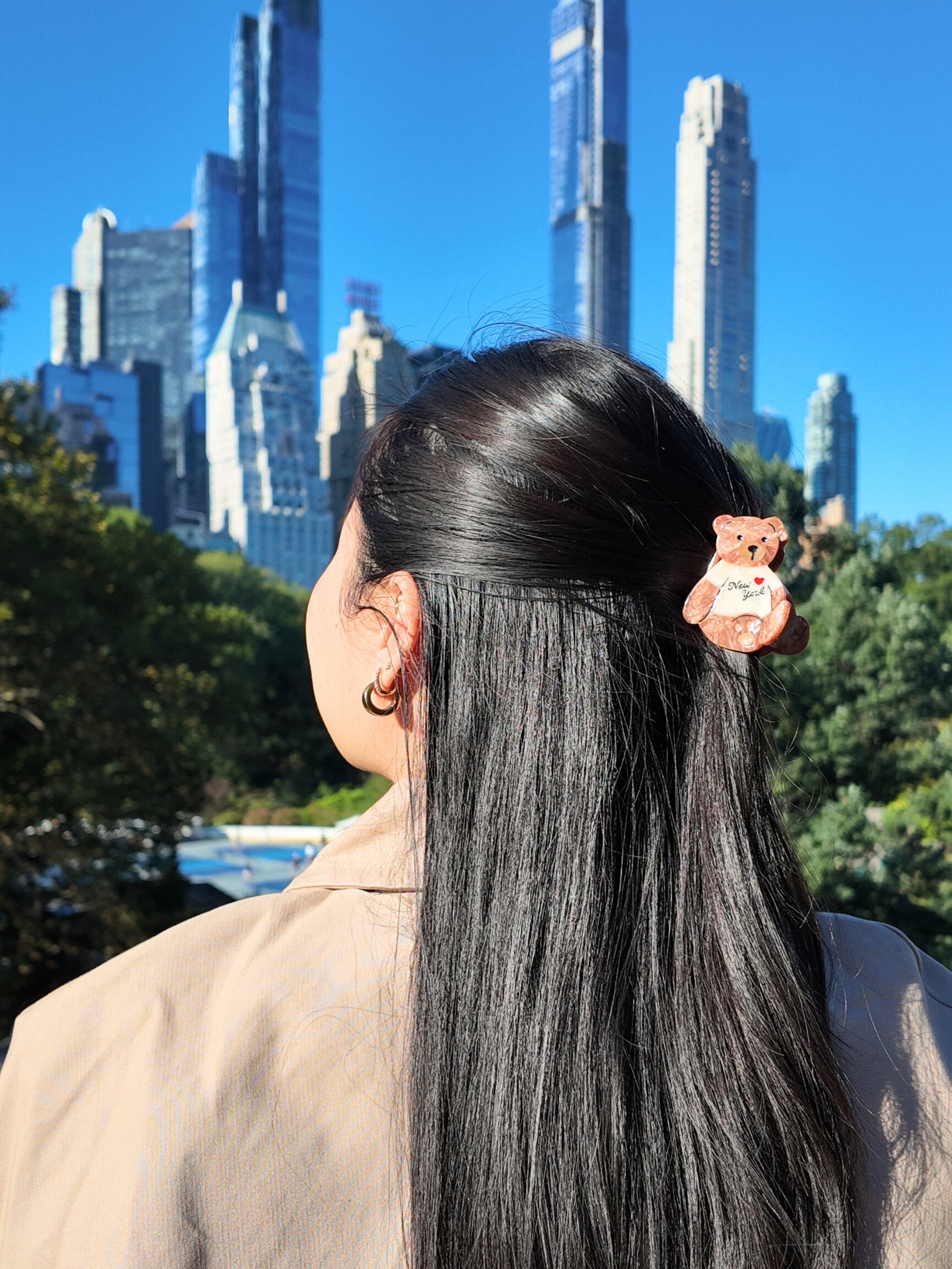 Hand-painted by our Solar Eclipse artists, the Mini New York Teddy Bear Hair Claw Clip is a charming accessory that adds a touch of NYC magic to your routine. Crafted in small batches, it’s designed to be treasured for years to come, offering both style and function.