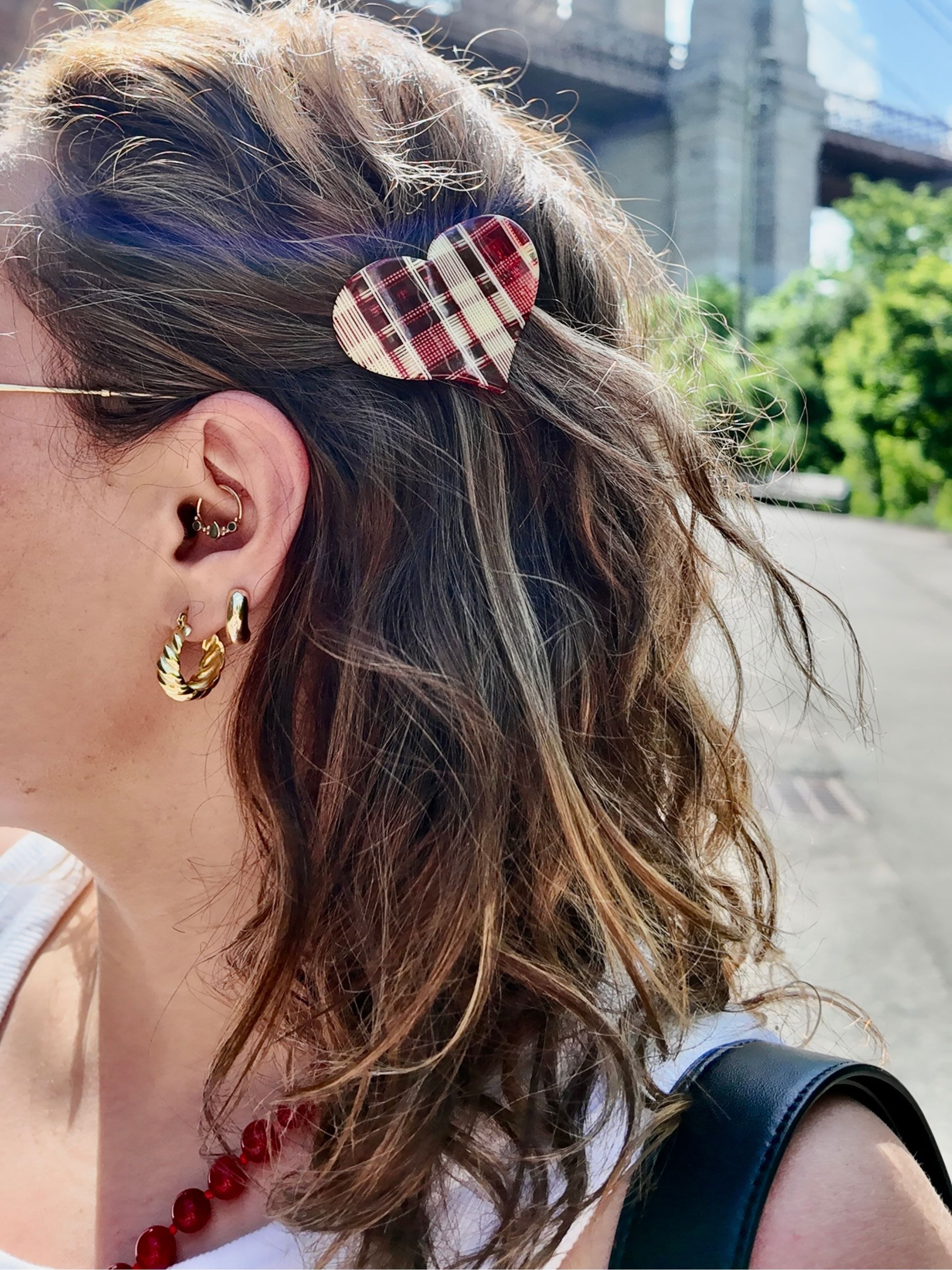 Meet the Mini Heart Lay down Hair Claw Clip—now in an exclusive, limited-edition Red Plaid color. Hand-painted by our Solar Eclipse artists, this clip features a playful heart design that’s equal parts cute and chic. A perfect blend of bold pattern and classic silhouette, it’s crafted in small batches to give your hair game a stylish upgrade.