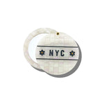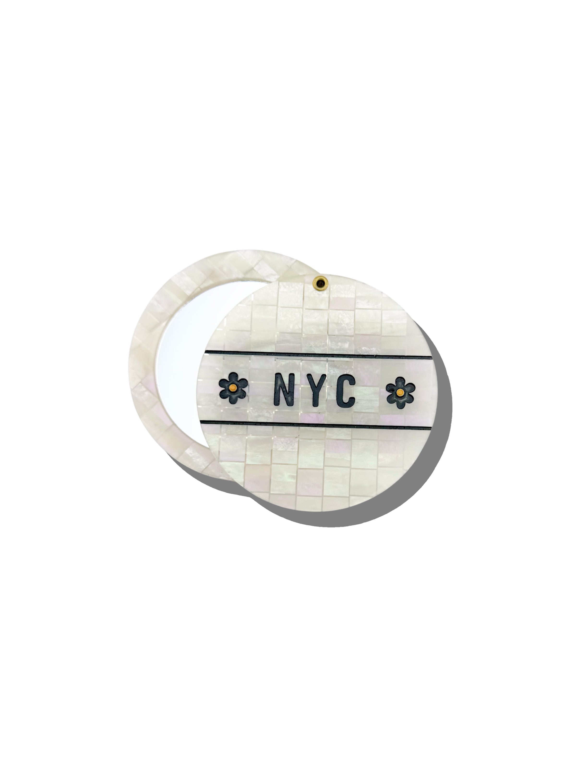 Each compact mirror features an original, hand-painted design by the artists at Solar Eclipse. NYC brings city energy into miniature — bold mosaic detailing that shimmer with metropolitan light.
