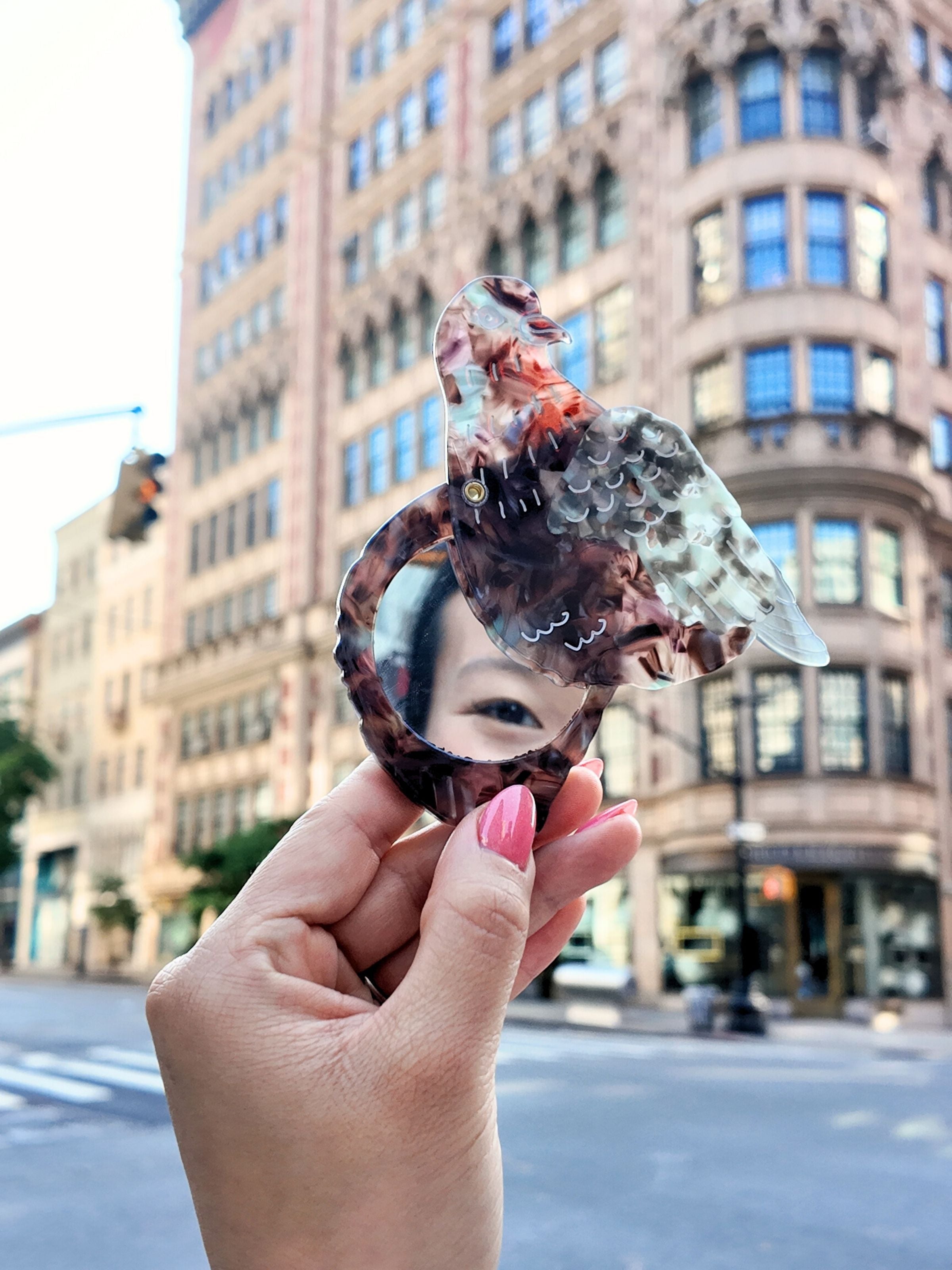 Each compact mirror features an original, hand-painted design by the artists at Solar Eclipse. Pigeon celebrates the unsung hero of the city — simple, smart, and quietly iconic, turning everyday urban grit into unexpected style.