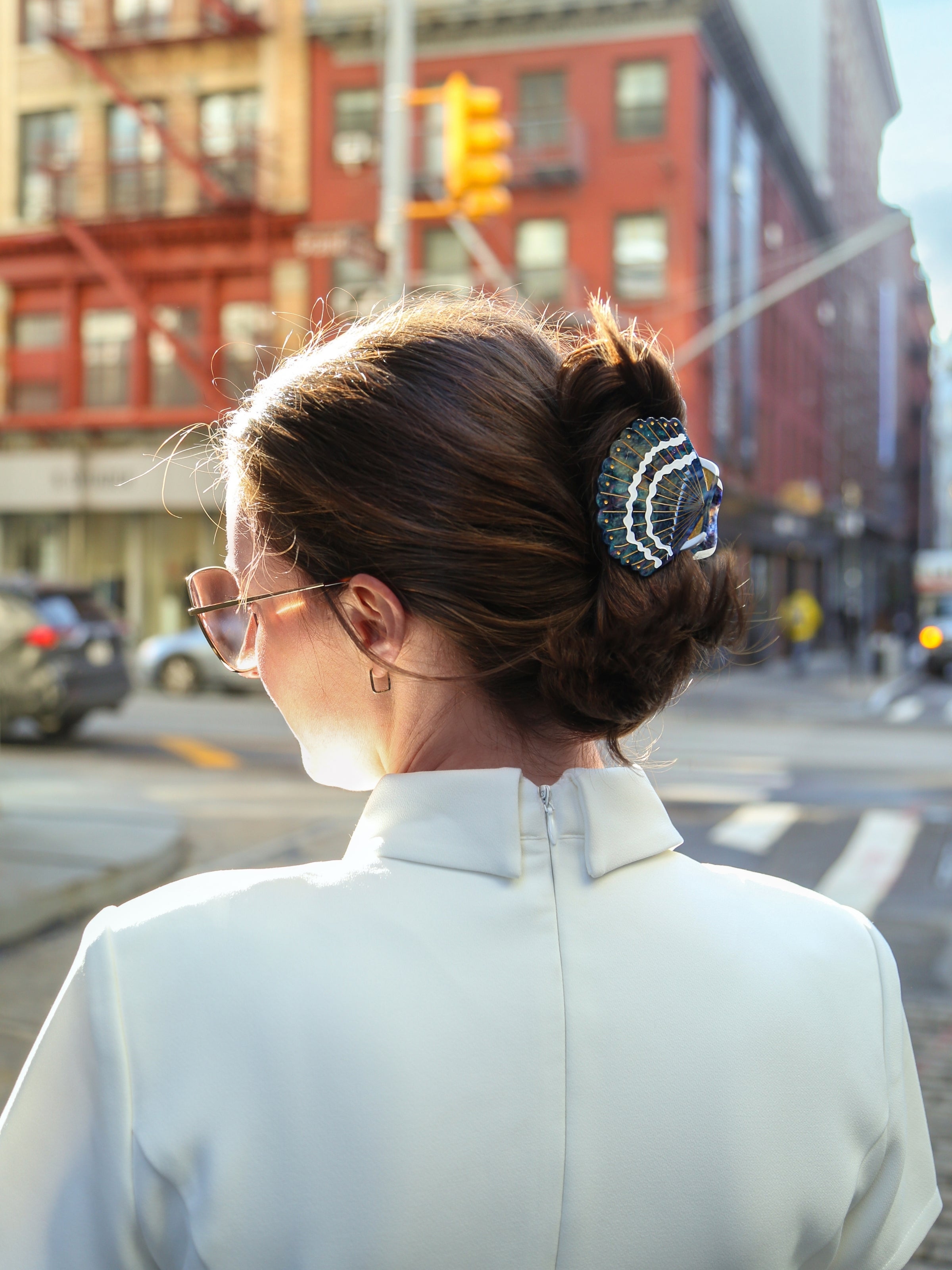 Handmade with our signature biodegradable acetate made from recycled wood pulp, it effortlessly holds hair for a secure all-day style.