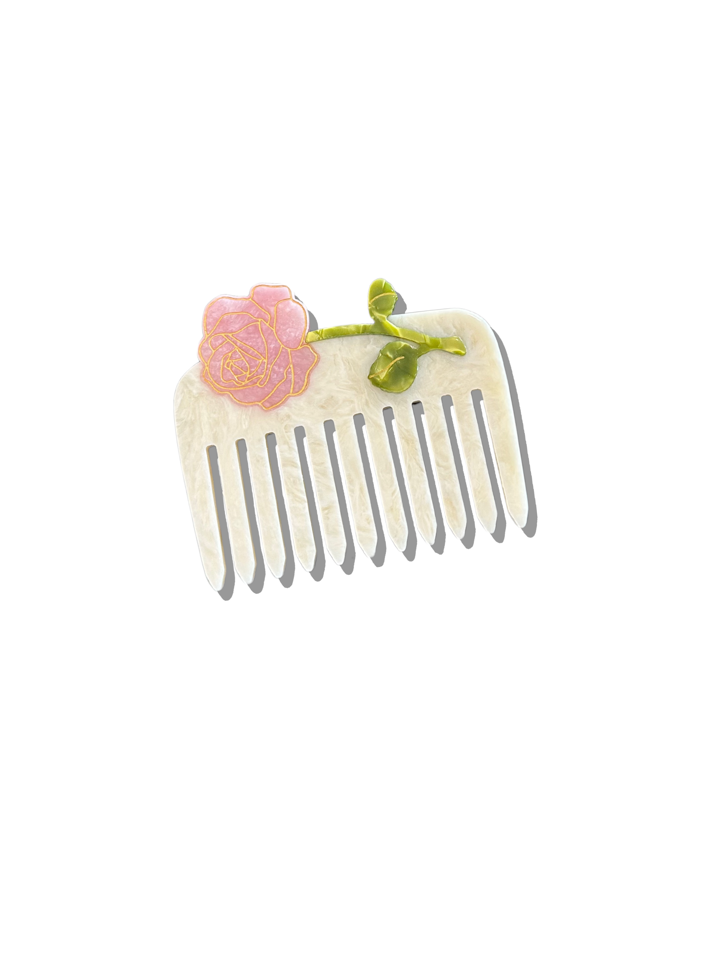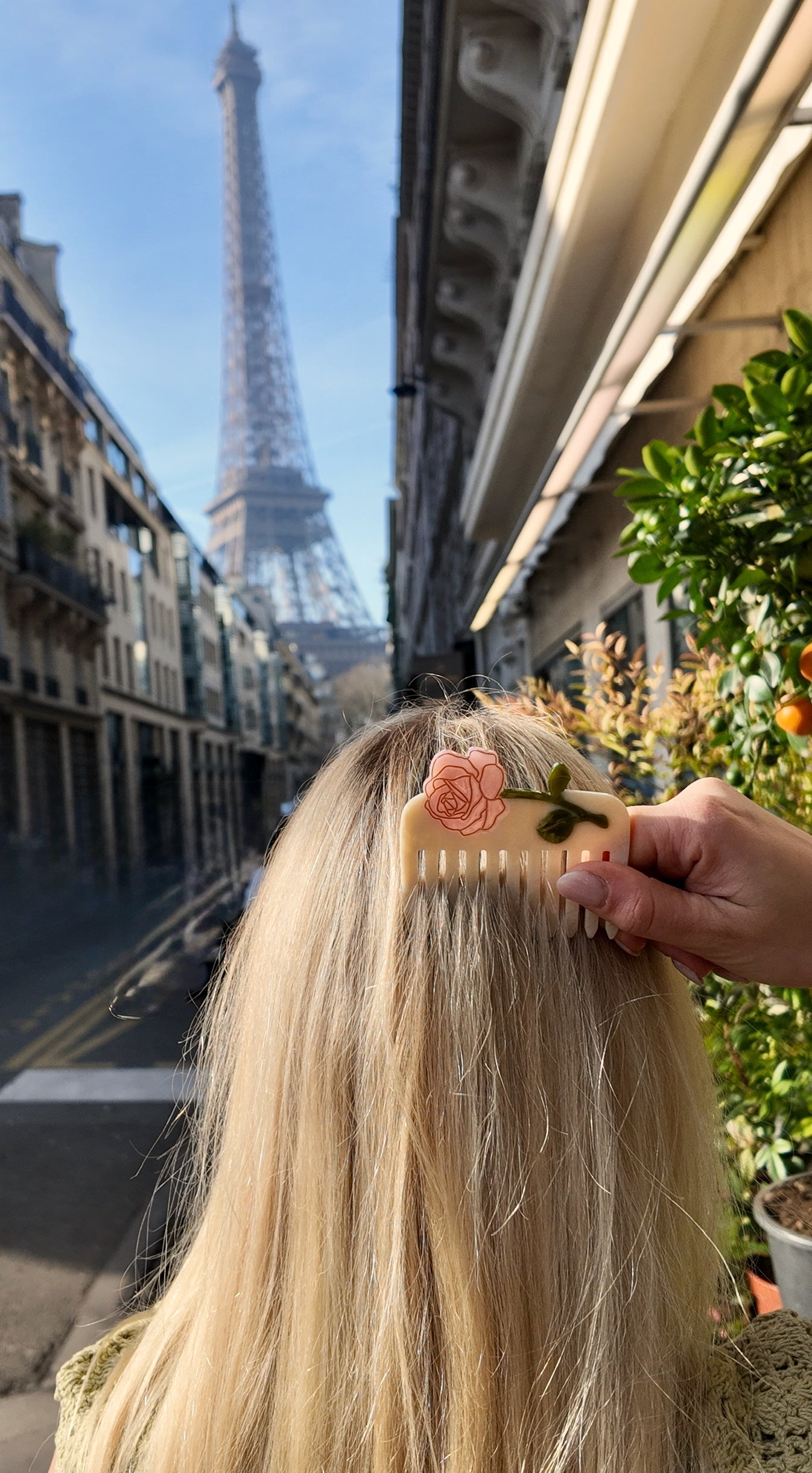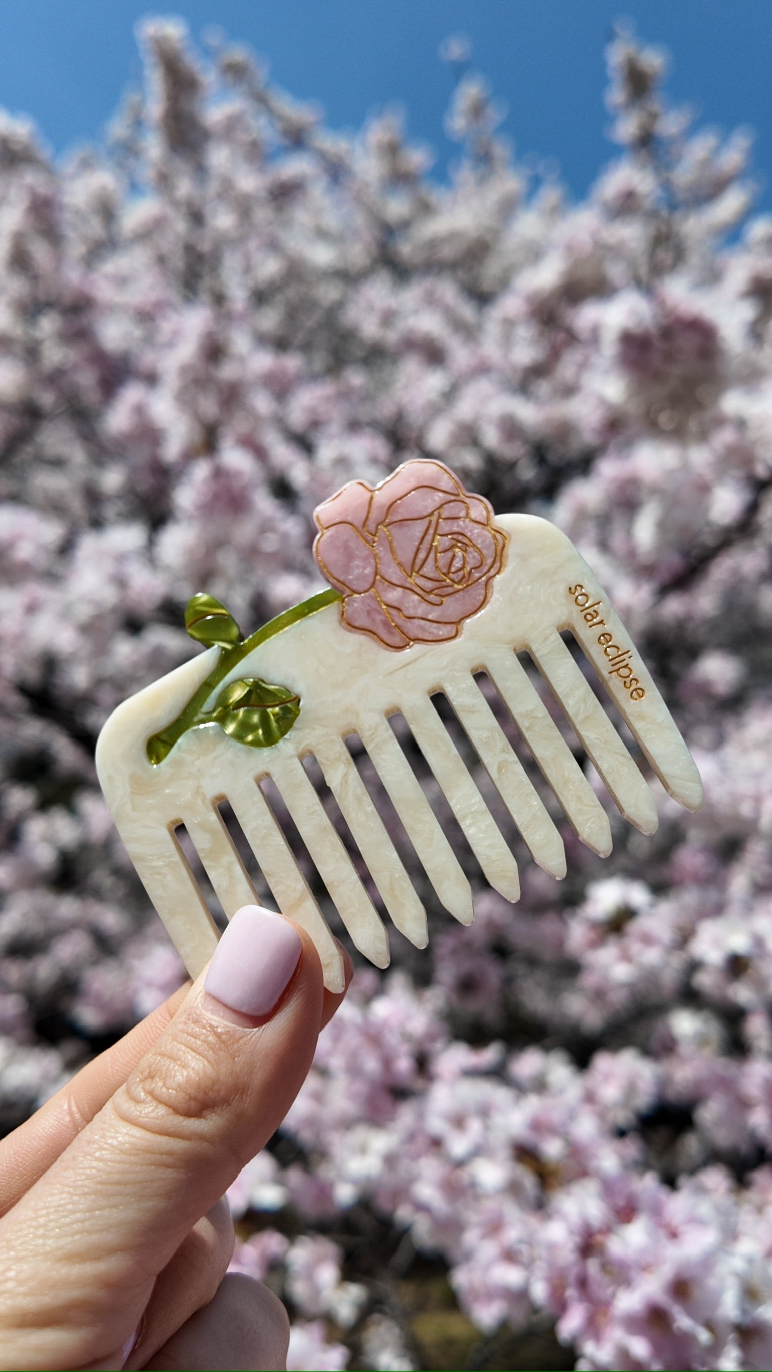 Each comb features an original, hand-painted design created by Solar Eclipse artists. This comb showcases our Spring Rose design—timeless and fresh, it’s a classic detail that brings softness and beauty to your day.