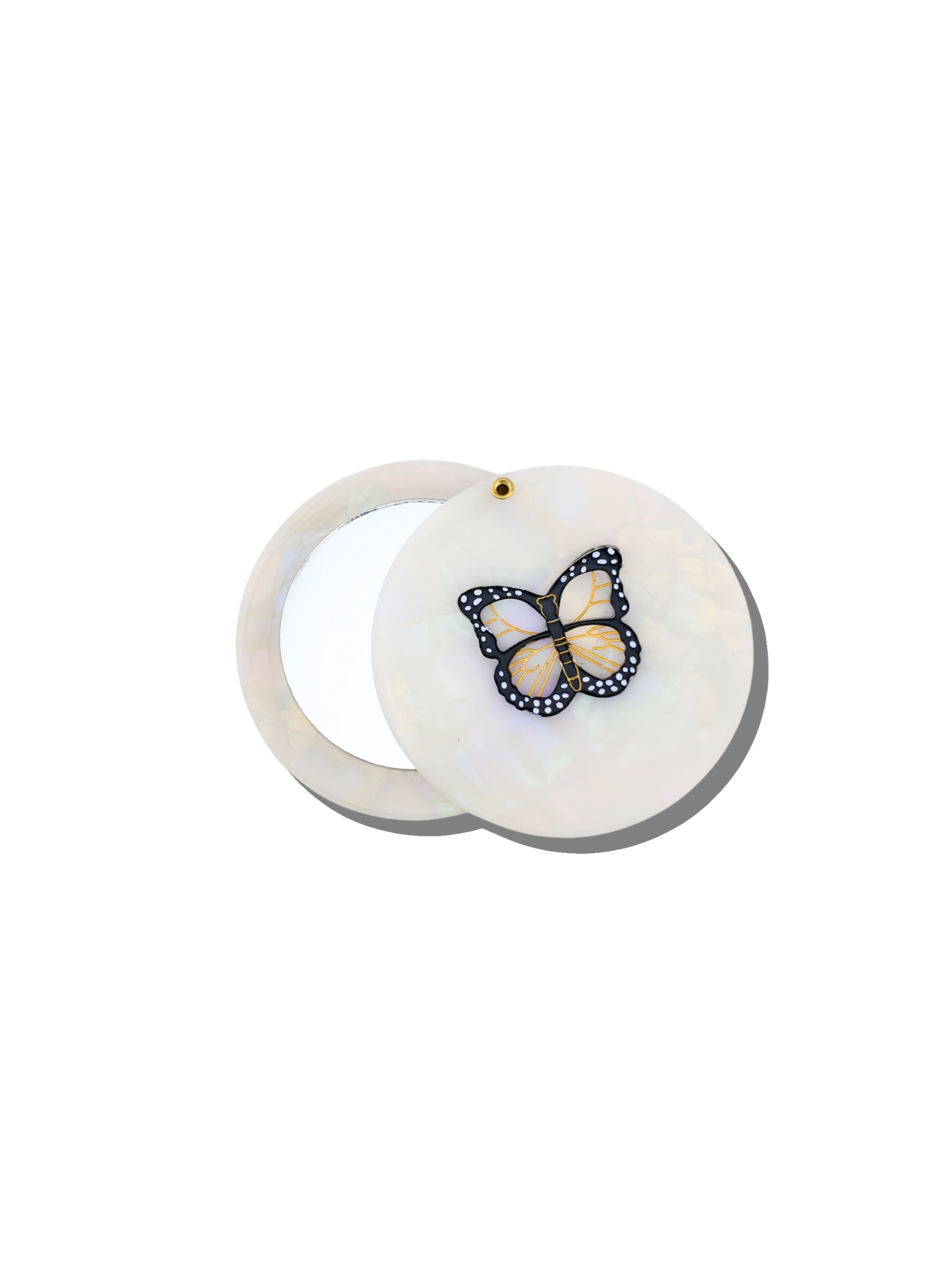 Each mirror features an original, hand-painted design created by Solar Eclipse artists. Featuring our bold Monarch Butterfly design, this mirror brings art-school energy to your bag. Graphic, graceful, and impossible to ignore—just like you.